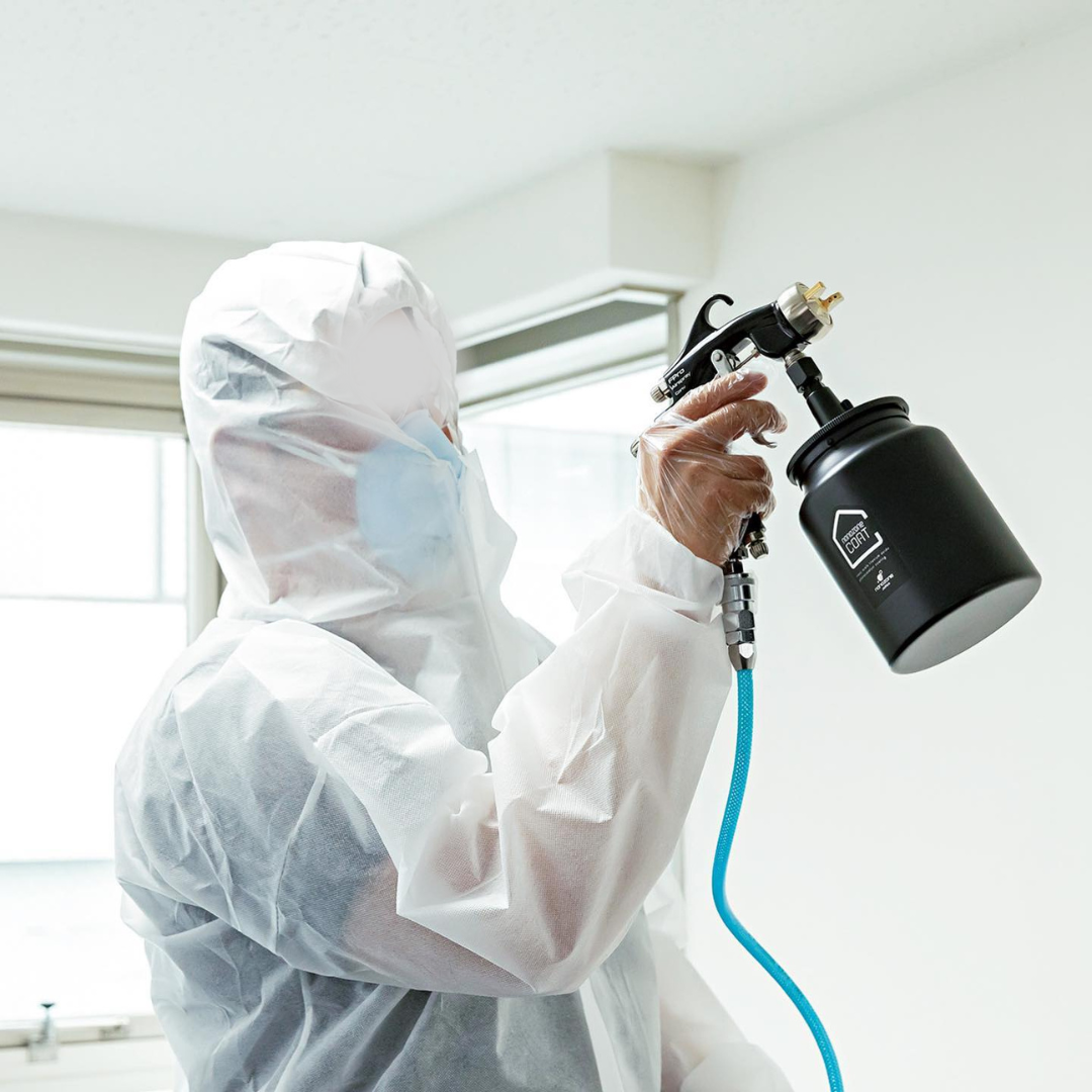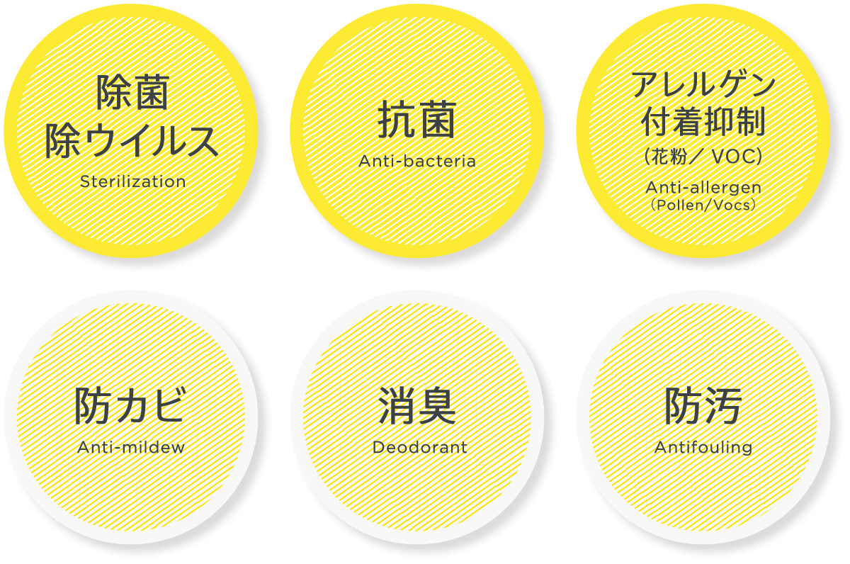 ナノゾーンコートは、自己結合性酸化チタン分散液「ナノゾーンソリューション」を原料とする、空間ケアコーティング。酸化チタンの光触媒作用で、菌やウイルスを大幅に低減。抗菌状態を保ちながら、花粉、VOC などのアレルゲンや、カビ、汚れ、臭いも持続的に抑制します。日本が誇る環境浄化技術「酸化チタン光触媒」を現代の暮らしにフィットさせた、新しい空間ケアサービスです。